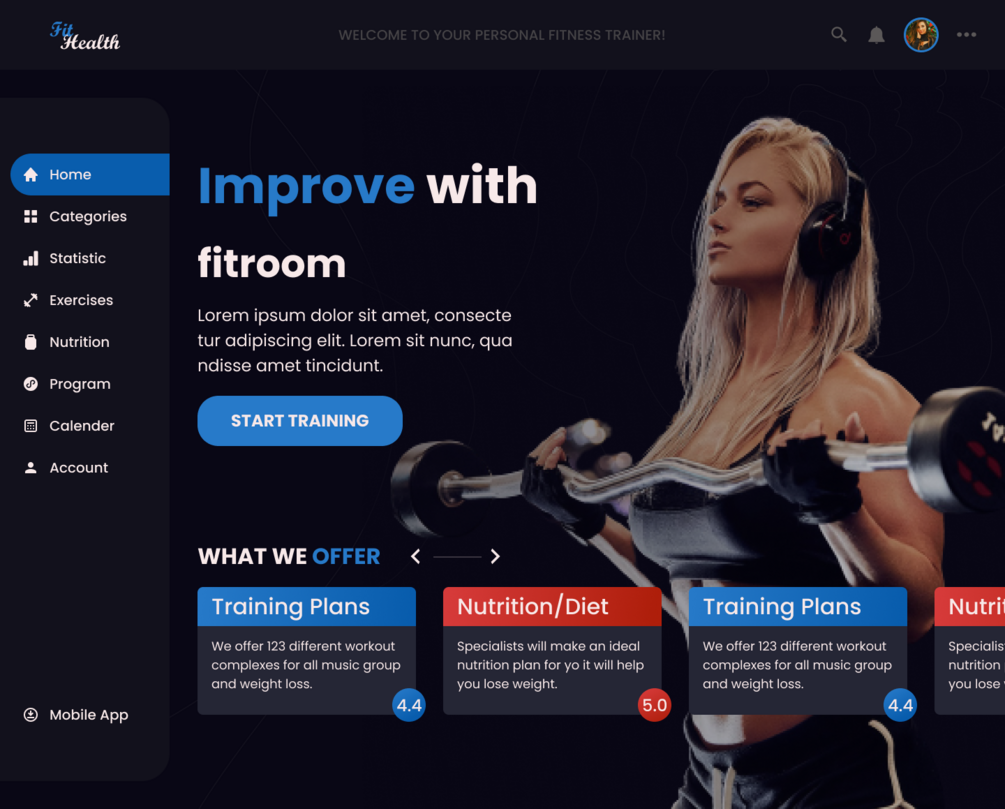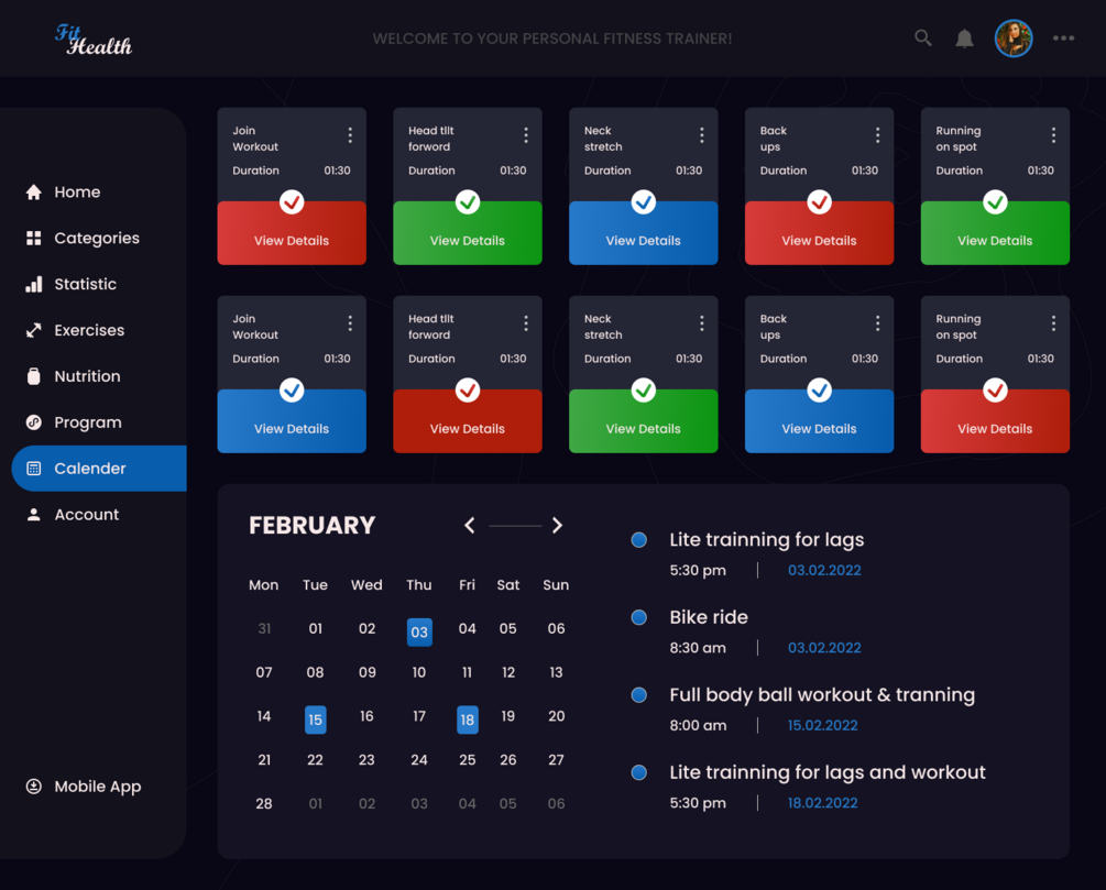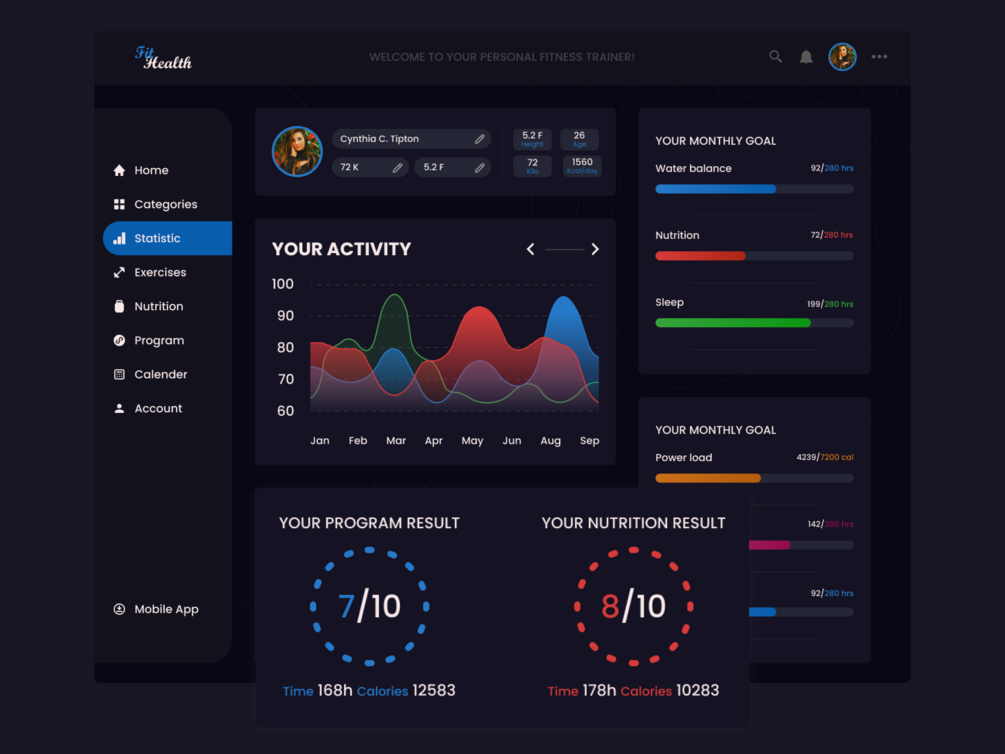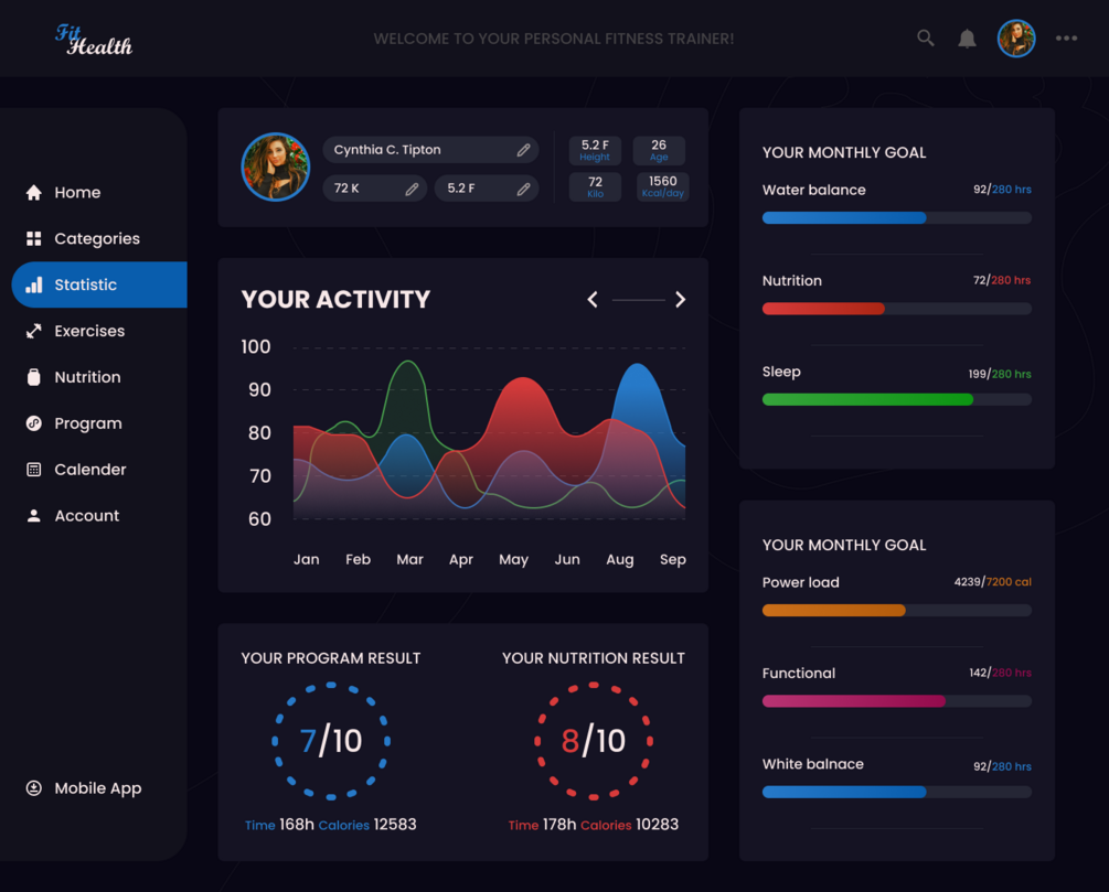Fit Health it's dashboard for people who loves fitness and want to controll daily using this application. Tags – game, design, fittness web design, designer, app, apps, graphic, graphic design, color, logo, packaging design, graphics, behance, dribble, photography, art, aplication, digital, club, fun,trend, adobe, adobe Photoshop, shop, magazine, store, art direction, brand, brand design, corporate, corporate website, ux, ui, ui/ux, interface, animation, user interface, game, user experience, startup, creative, illustration icon.
