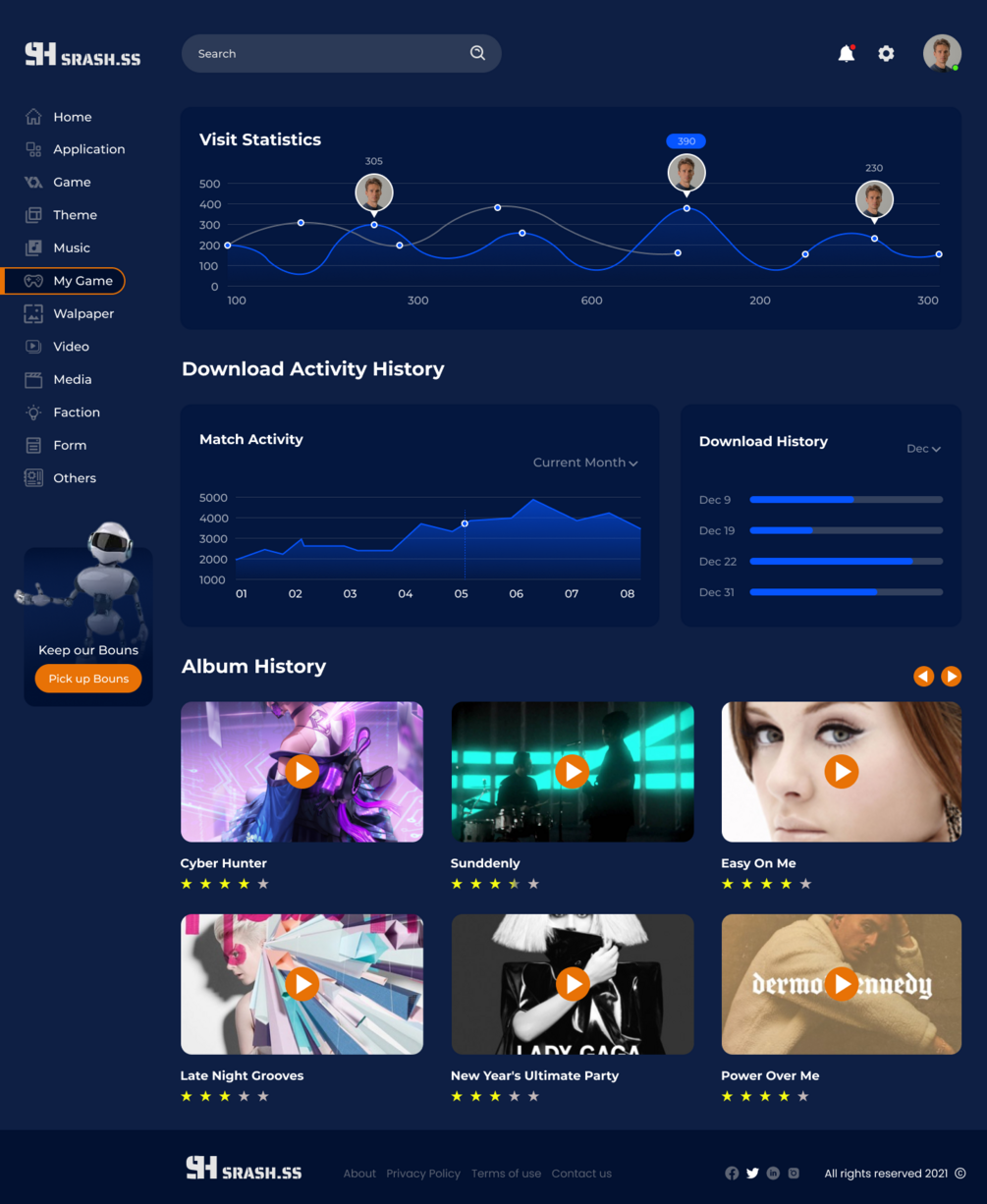 Srash dashboard like play market. Where customers can download games also watch streams and listen music. design, web design, designer, app, apps, graphic, graphic design, color, fun,trend, adobe, adobe Photoshop, shop, magazine, store, art direction, brand, brand design, corporate, corporate website, ux, ui, ui/ux, interface