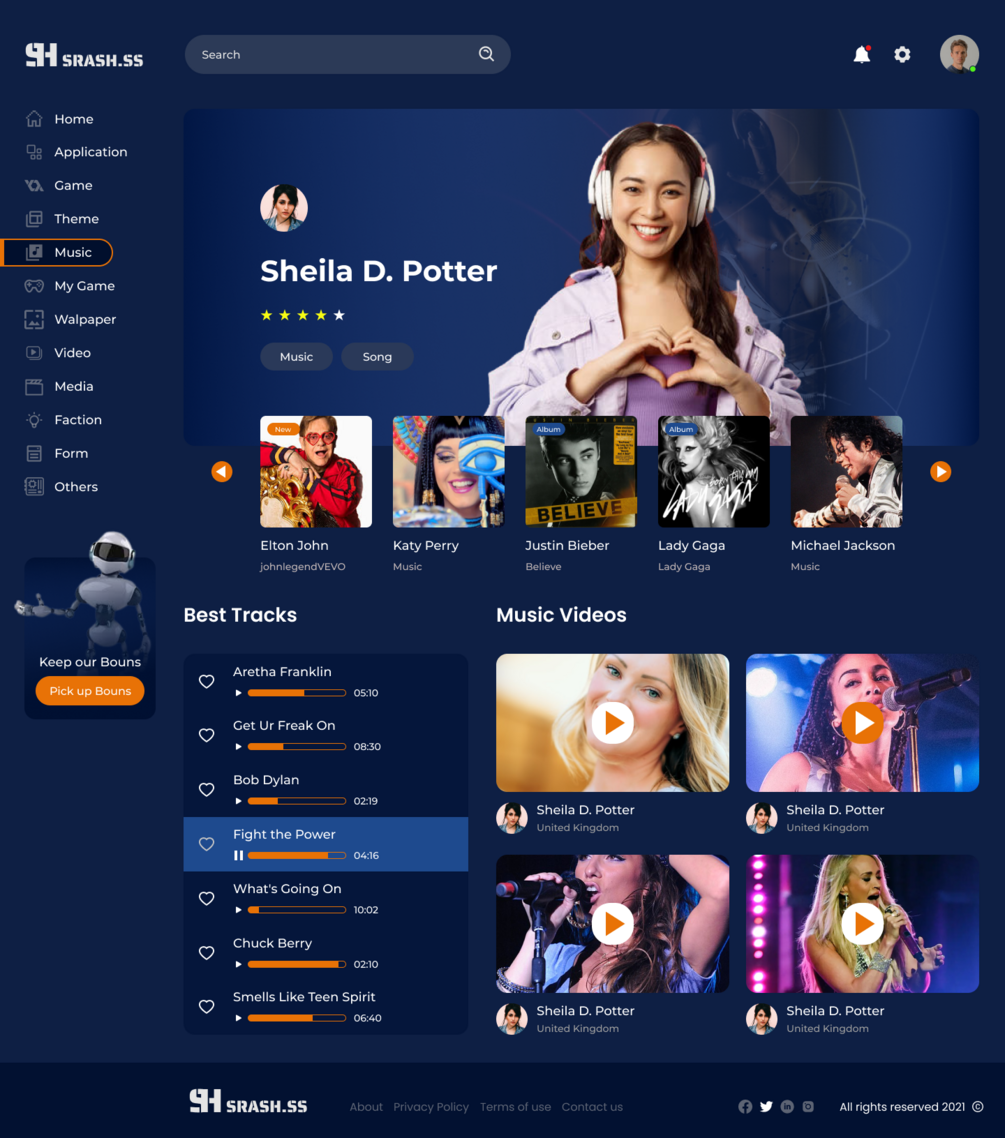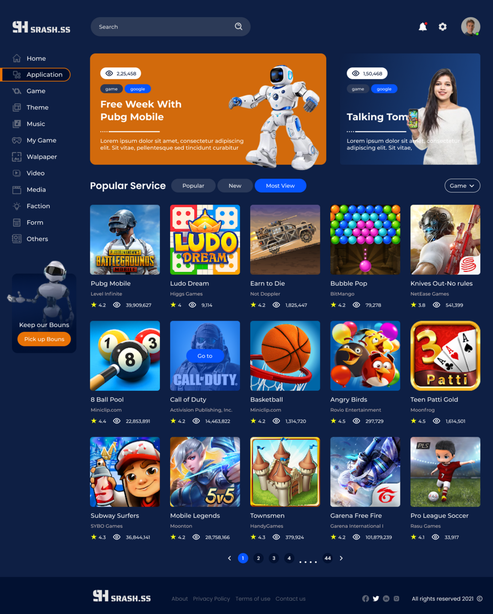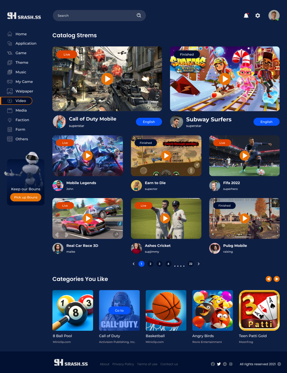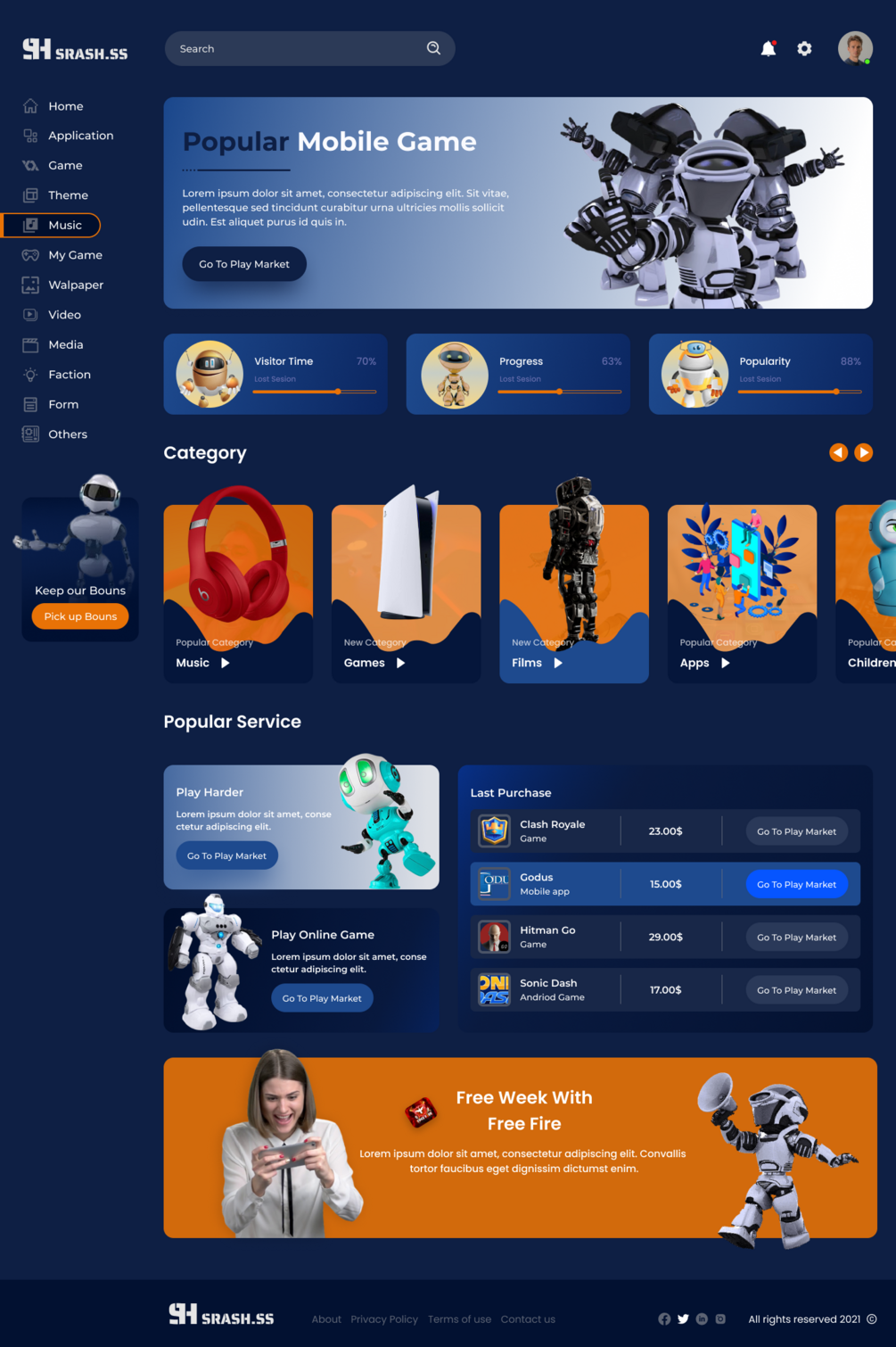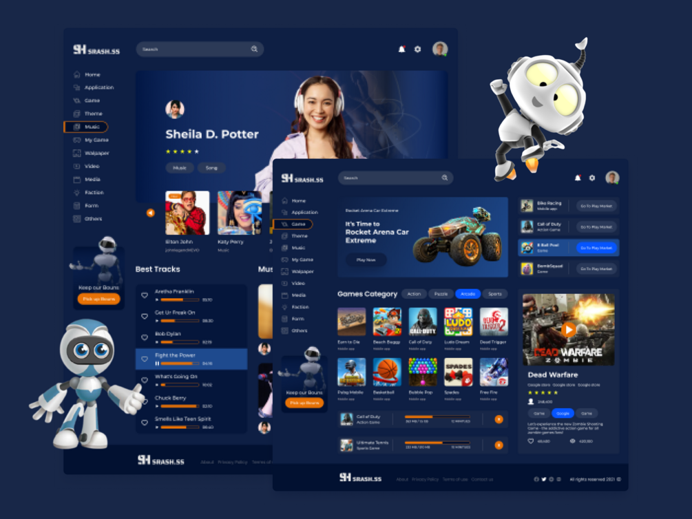 Srash dashboard like play market. Where customers can download games also watch streams and listen music. design, web design, designer, app, apps, graphic, graphic design, color, fun,trend, adobe, adobe Photoshop, shop, magazine, store, art direction, brand, brand design, corporate, corporate website, ux, ui, ui/ux, interface